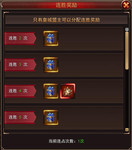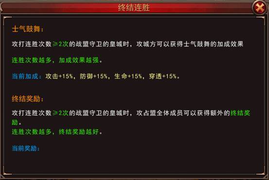攻打连胜次数≥2次的战盟守卫的皇城时,攻城方可获得士气鼓舞效果,攻占成功时,攻占盟全体成员豆科获得额外的终结奖励!